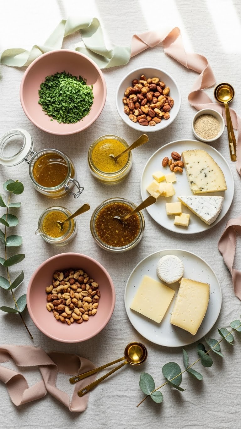 - Arrange cheese, meats, and crackers on boards but add fresh herbs and edible flowers later.