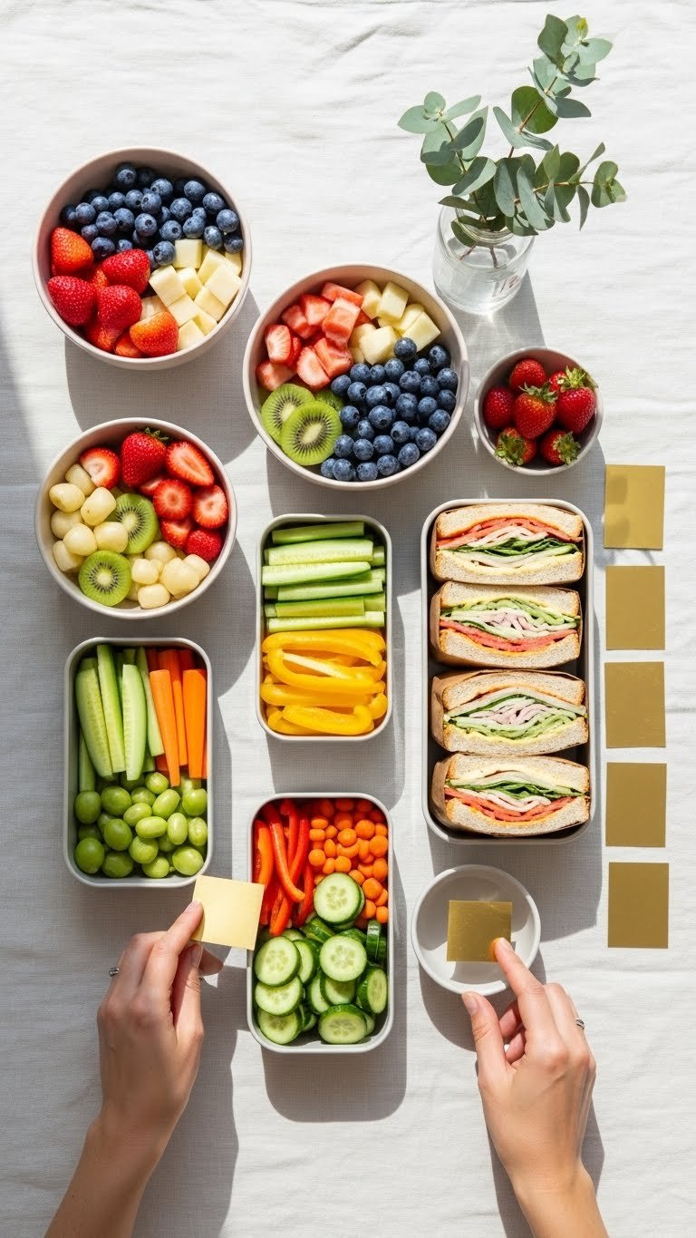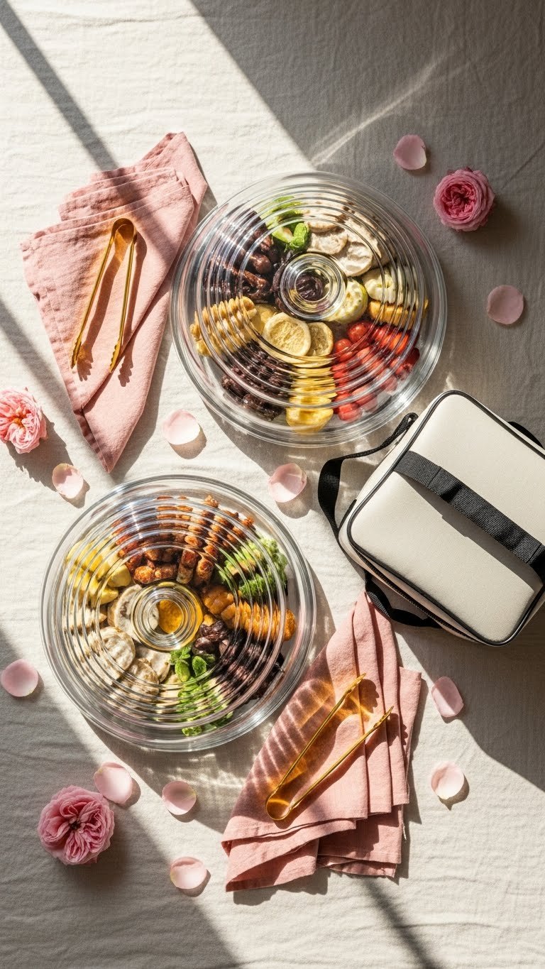 Tip: choose foods that plate well at room temperature, like marinated vegetables and cold sandwiches.