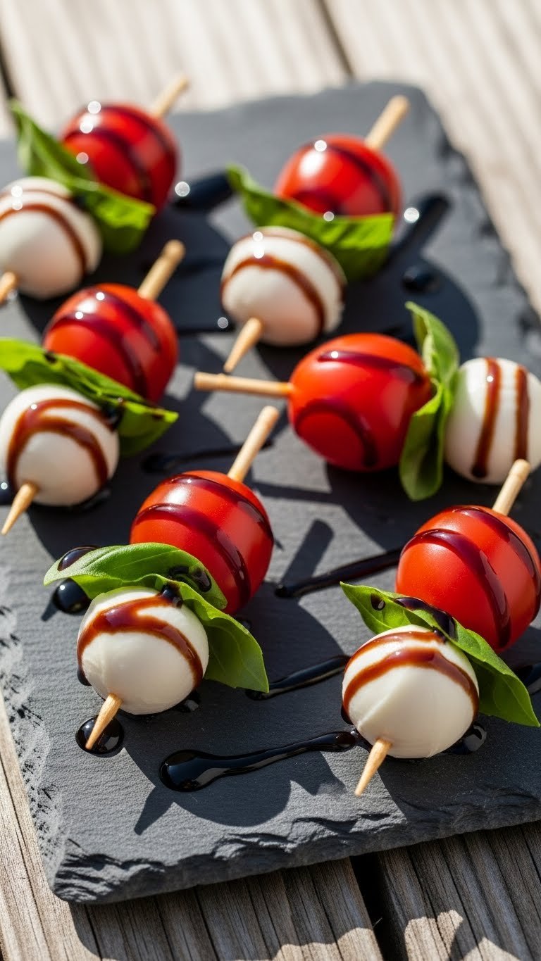 Serve skewers on a chilled slate or wooden board with extra glaze in a small jar. Garnish with torn basil and a sprinkle of flaky salt. Pair with chilled Prosecco or an iced herbal tea. Make ahead: assemble skewers and glaze separately; glaze just before serving.