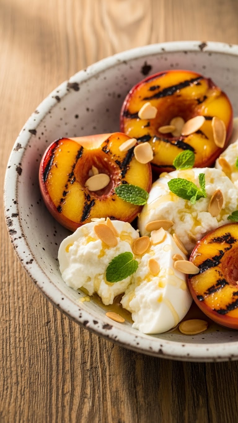 - Grill peach halves 2–3 minutes per side until grill marks appear and fruit softens.