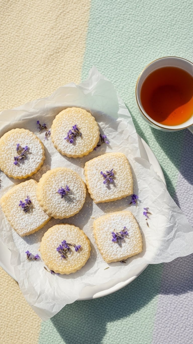 Pack cookies in a tin with parchment to keep them crisp. Garnish serving plate with lavender sprigs and lemon slices. Pair with iced tea, lemonade, or a light dessert wine. Store in an airtight container for 5 days. Make ahead: bake up to 3 days in advance.