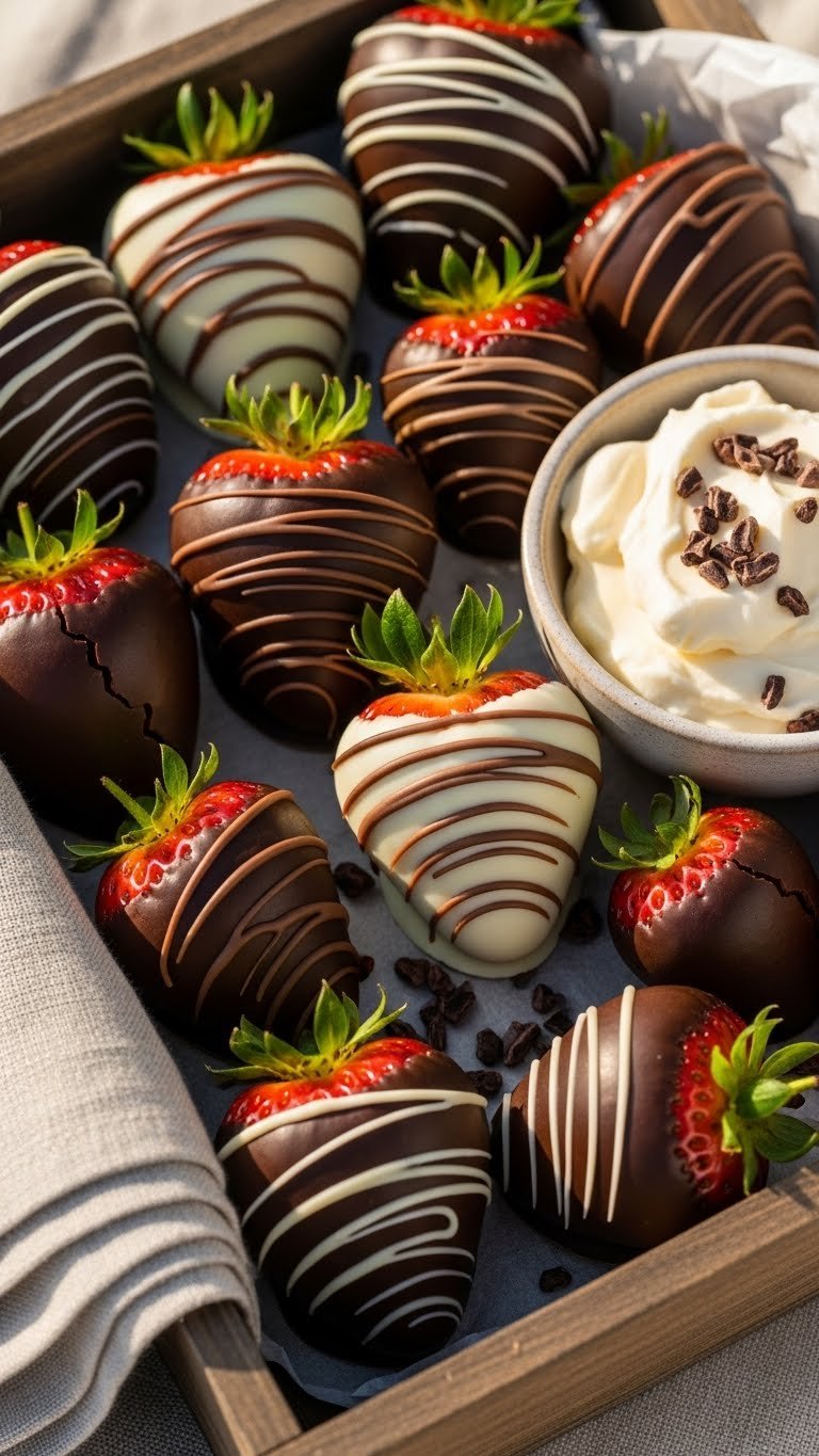 - Place strawberries on parchment and chill 15–20 minutes until chocolate sets.