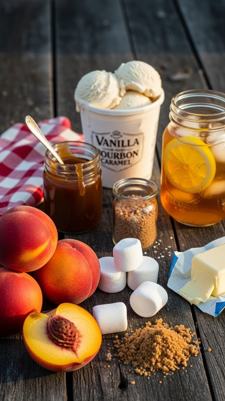 - 2–3 ripe peaches (halved), 1 cup brown sugar, 2 tbsp butter