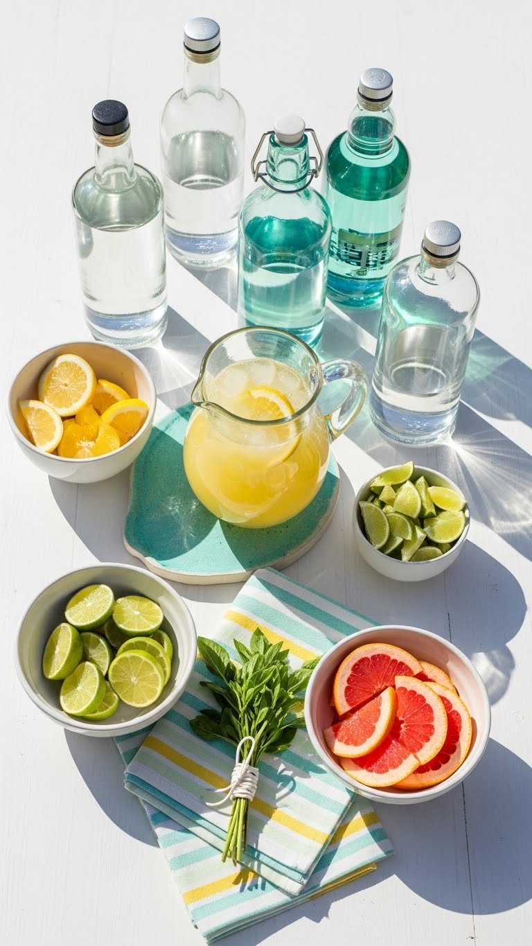 - Prep garnishes ahead: lemon and lime wheels, cucumber slices, mint sprigs, and salt/sugar rims in small bowls.