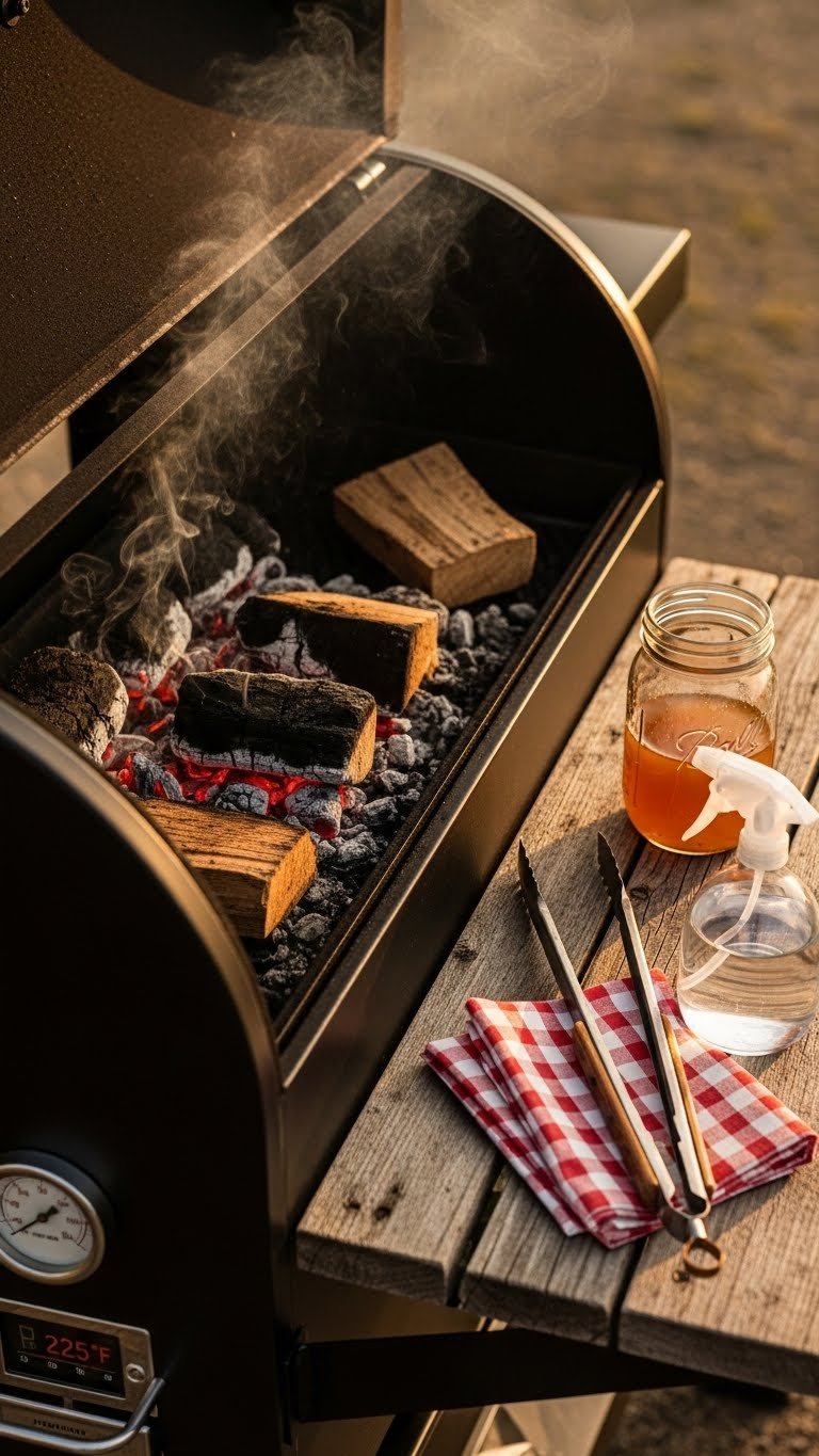 - Add wood chunks when coals are stable. Use a water pan to keep humidity steady.