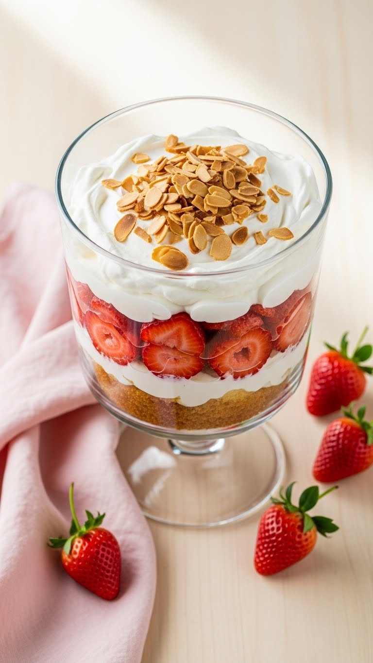 - Scatter toasted almonds and garnish with fresh mint and a few strawberry slices.