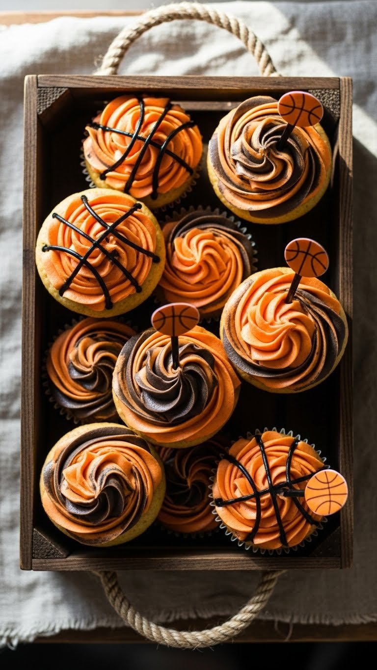 These basketball swirl cupcakes are light, moist, and topped with a buttercream textured like a basketball. They’re bright, orange, and perfect for a fun shower display.