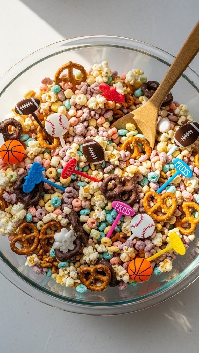 This cheerful popcorn and pretzel snack mix hits sweet and salty notes. It’s crunchy with chewy candy pieces and salty pretzels. It’s perfect for a casual, sports-style baby shower buffet.