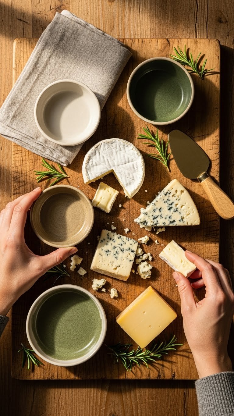 - Large wooden board (18–24 inches), small ceramic bowls, cheese knives, brass spreaders, small serving spoons
