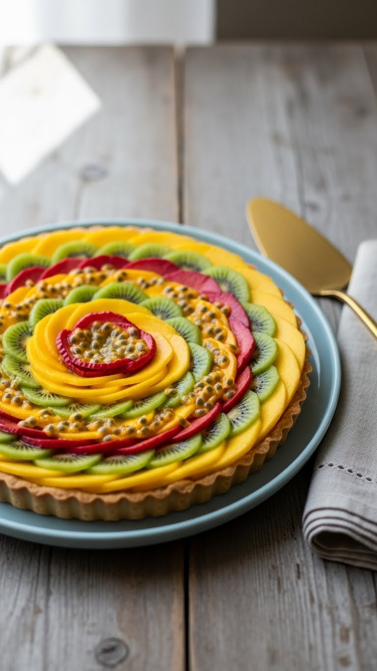 - Spread chilled pastry cream into cooled crust. Arrange sliced mango and kiwi in rings. Spoon passionfruit pulp over the top for shine. Chill 1 hour to set.