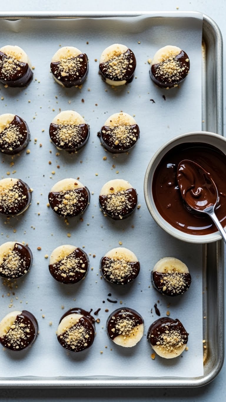 These chocolate-dipped frozen banana bites are simple, chilly, and addictive. Slices of banana get a dark chocolate coating and crunchy topping, then freeze into perfect snack-size treats. They’re a playful summer dessert that guests can grab from a platter. If you love quick, frosty sweets, these will disappear fast.