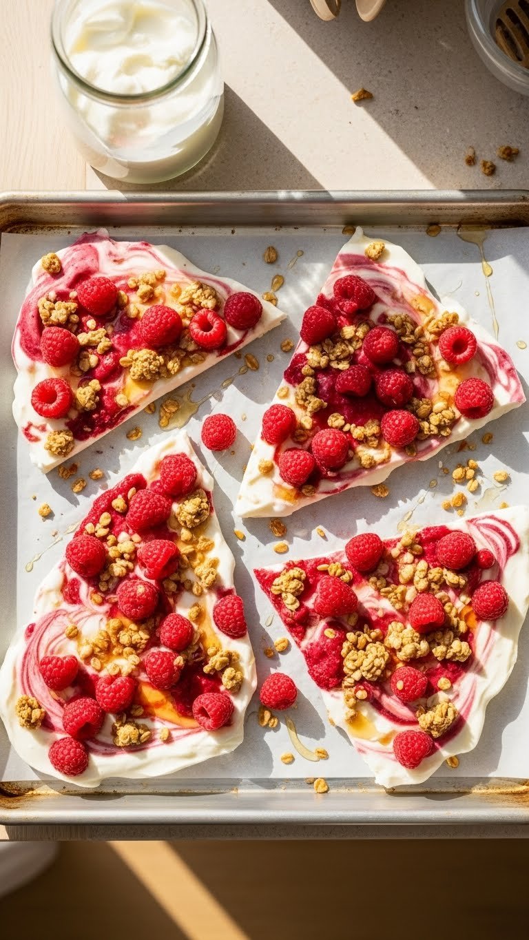 This raspberry frozen yogurt bark is cool, tangy, and delightfully crunchy. Thick yogurt spread with jammy raspberries and granola freezes into shards perfect for snacking. It’s a light dessert alternative that still satisfies cravings. Guests will love the creamy texture and fruity bursts.