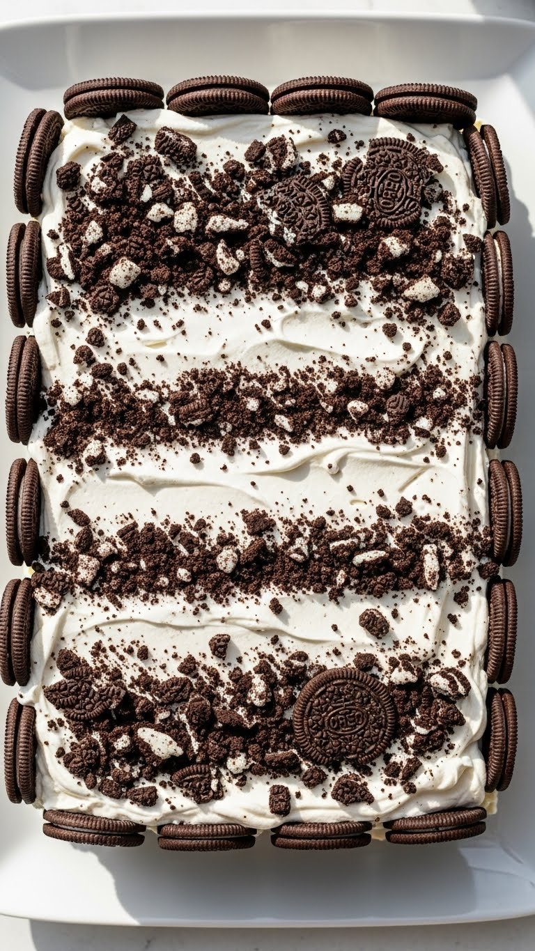 - Arrange a single layer of Oreo cookies at the bottom of the pan. Spread a thin layer of cream mixture over cookies. Repeat layers, ending with a cream layer on top. Smash a few cookies and sprinkle crumbs on top.