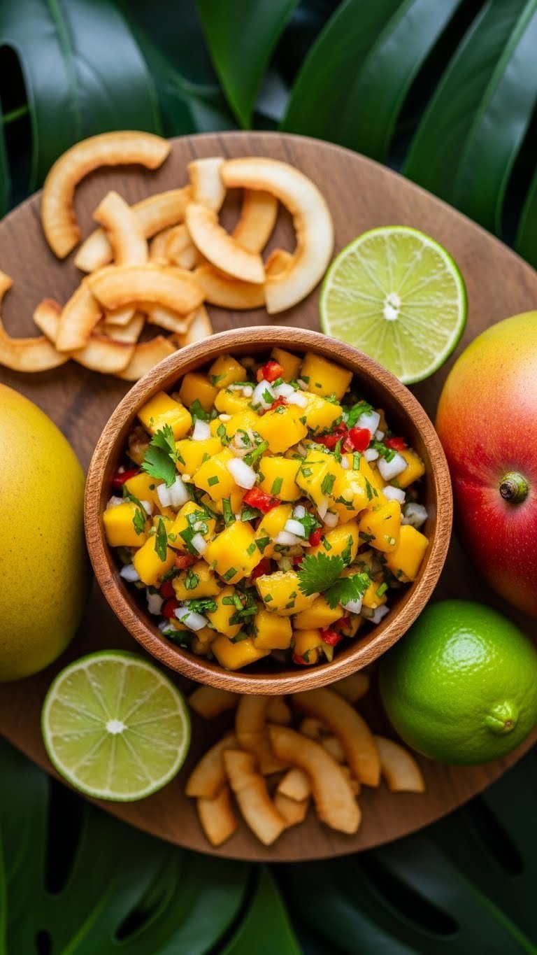Spoon into a shallow bowl on a bright serving plate. Garnish with cilantro leaves and lime zest. Pair with grilled mahi-mahi or coconut shrimp. Store covered in the fridge up to 2 days—mango softens over time. Make salsa up to a day ahead and hold chips separately for crunch.