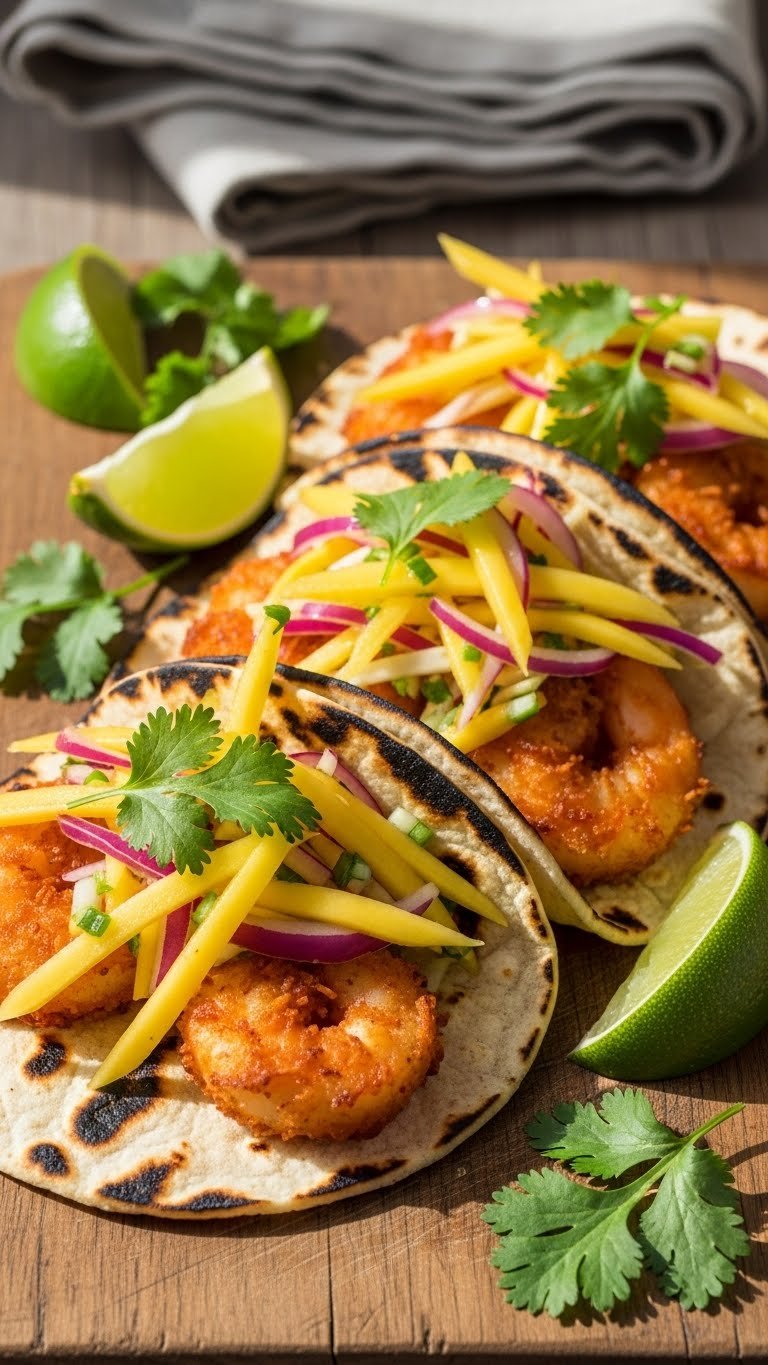 - Assemble tacos with shrimp and mango slaw. Add extra lime squeeze.