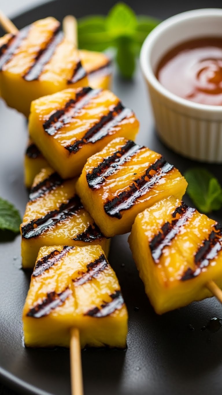 Serve warm on a platter with mint sprigs. Pair with rum cocktails or cold beer. Top with a scoop of vanilla ice cream for a dessert twist. Store leftover grilled pineapple in fridge up to 3 days; reheat briefly to refresh. Make marinade and pineapple ahead; skewer and grill just before serving.