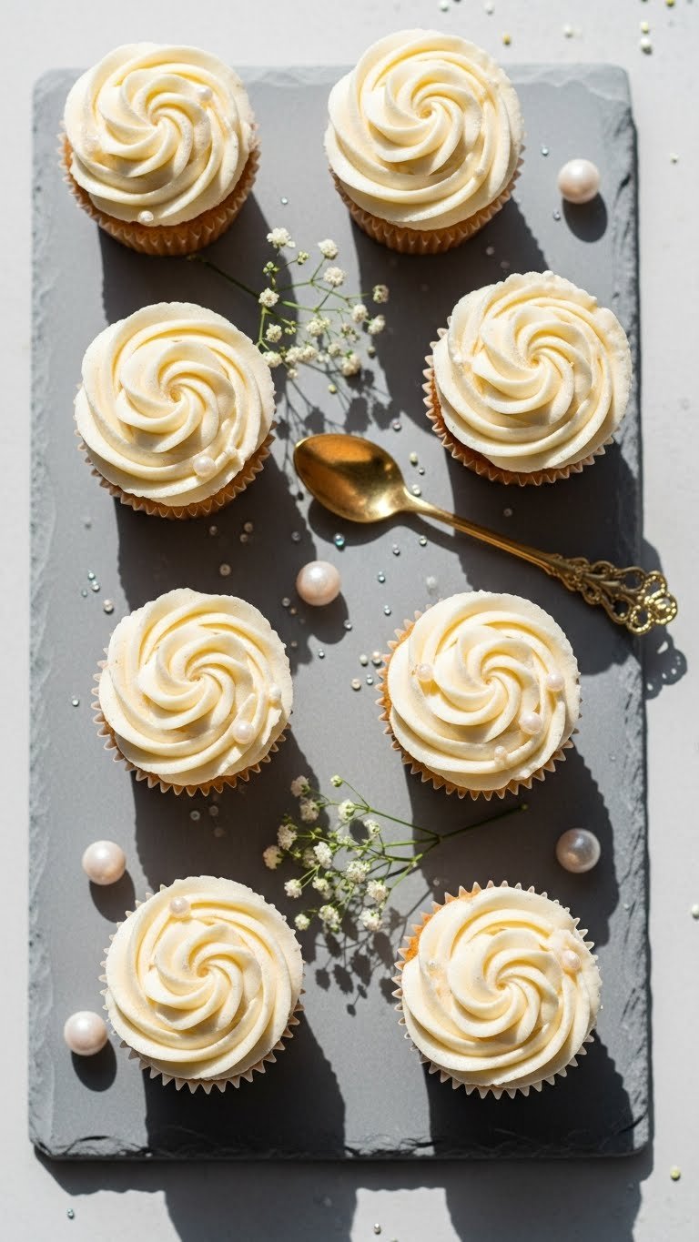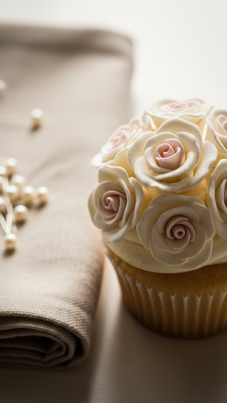 This topper uses buttercream piped into classic rosettes. The texture is silky and airy. The pearl dust adds luxe shimmer without being heavy. It’s a crowd-pleaser and pairs well with light cake flavors. You’ll love the soft vanilla aroma and the creaminess against a moist cupcake.