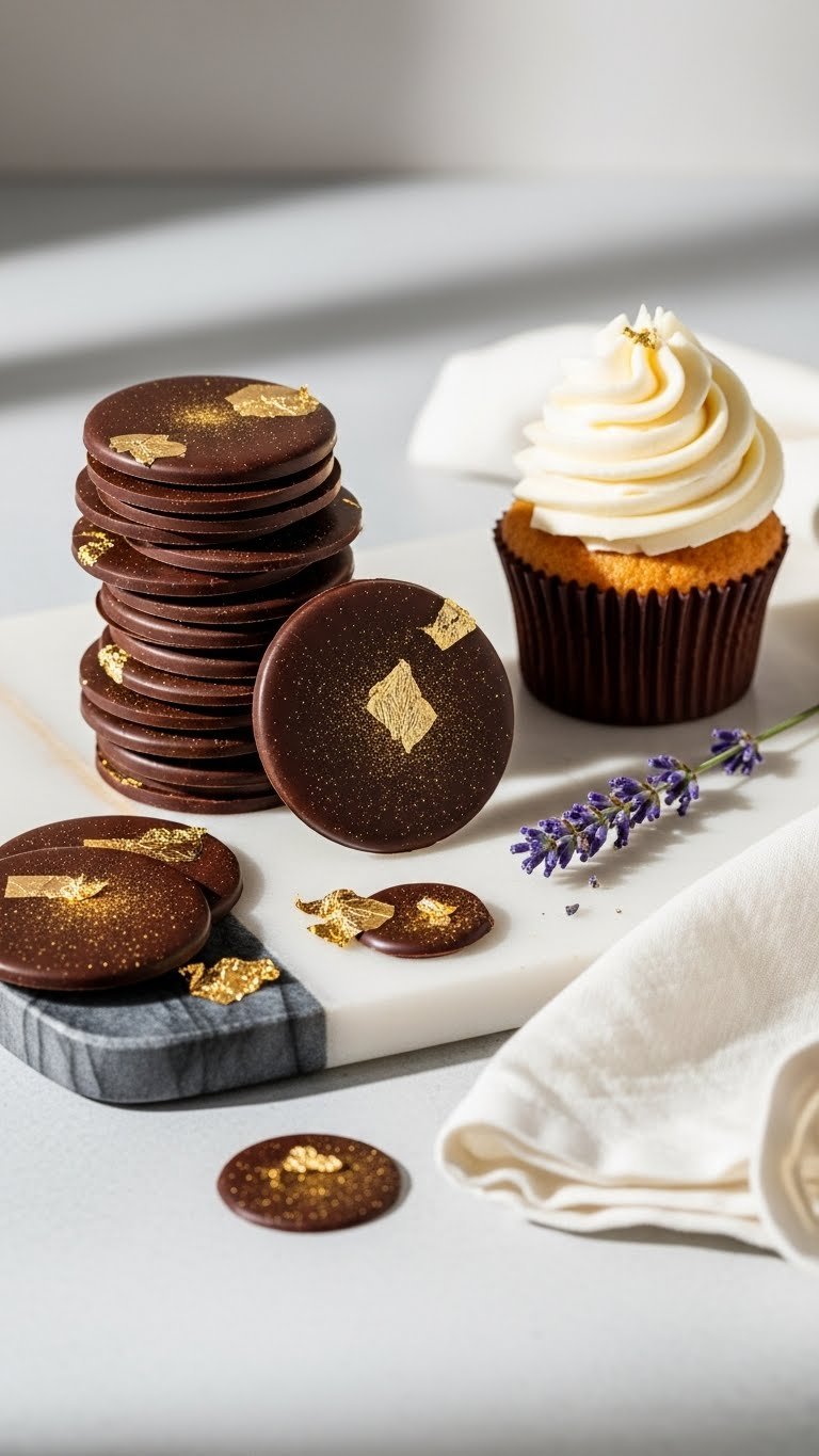 These chocolate disks are sleek and modern. The chocolate gives a firm, glossy snap. Gold leaf adds luxe metallic shine. They’re perfect for black-tie and modern weddings. You’ll like the contrast of rich chocolate and delicate metallic shimmer.