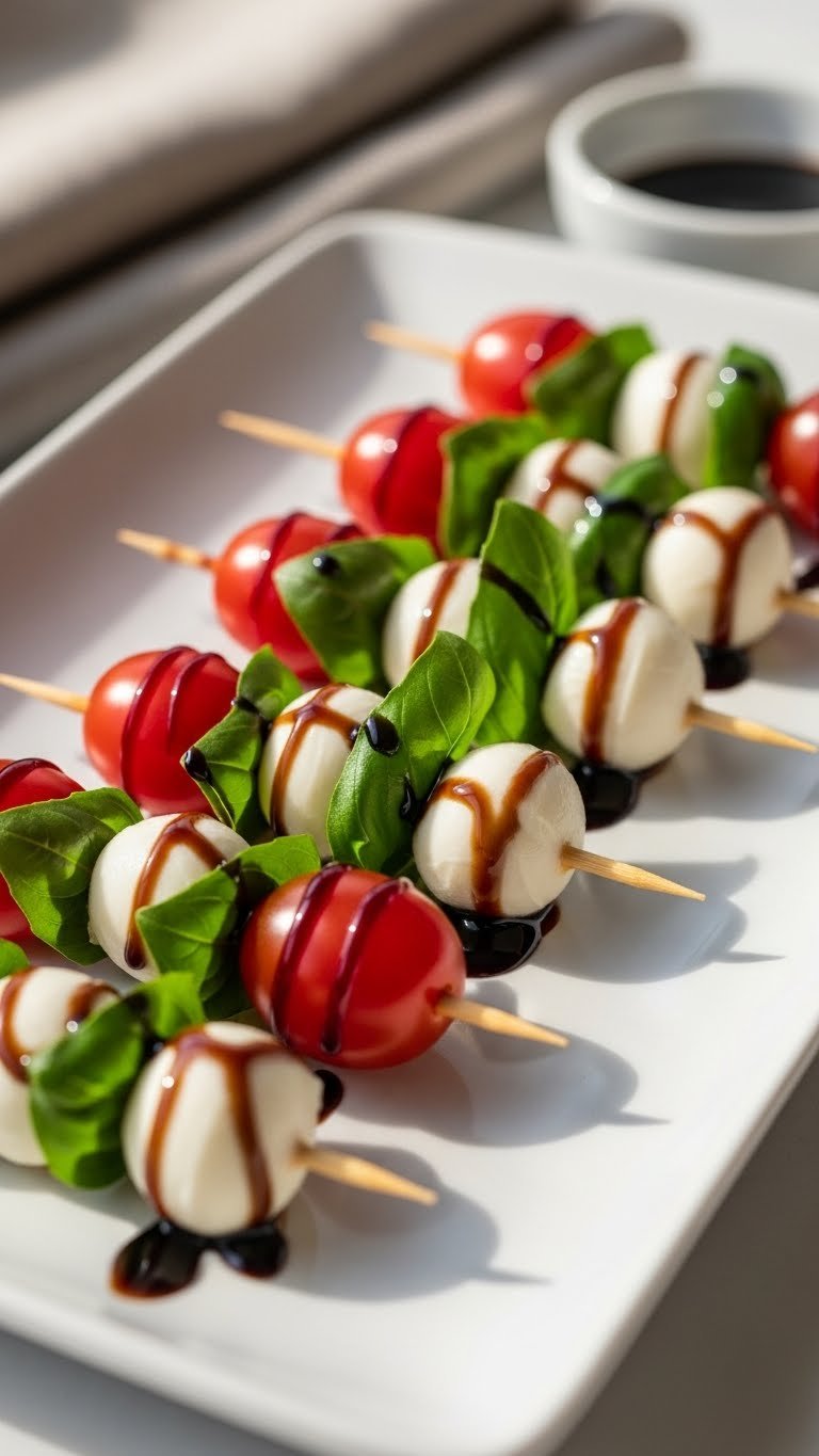 Serve on a long white platter for contrast. Garnish with whole basil sprigs and a few lemon wedges. Pair with a crisp Prosecco or a rosemary lemonade. Store leftovers in an airtight container for up to 24 hours. Make-ahead: assemble skewers up to 2 hours ahead; dress just before guests arrive.