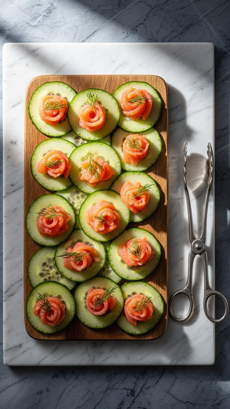 Plate on a slate board for color contrast. Add lemon wedges and extra dill. Pair with chilled sparkling water or a light sauvignon blanc. Store leftovers in a single layer in the fridge up to 24 hours; cream may soften the cucumbers. Make-ahead: prepare cream cheese spread and slice cucumbers ahead; assemble within 1–3 hours.