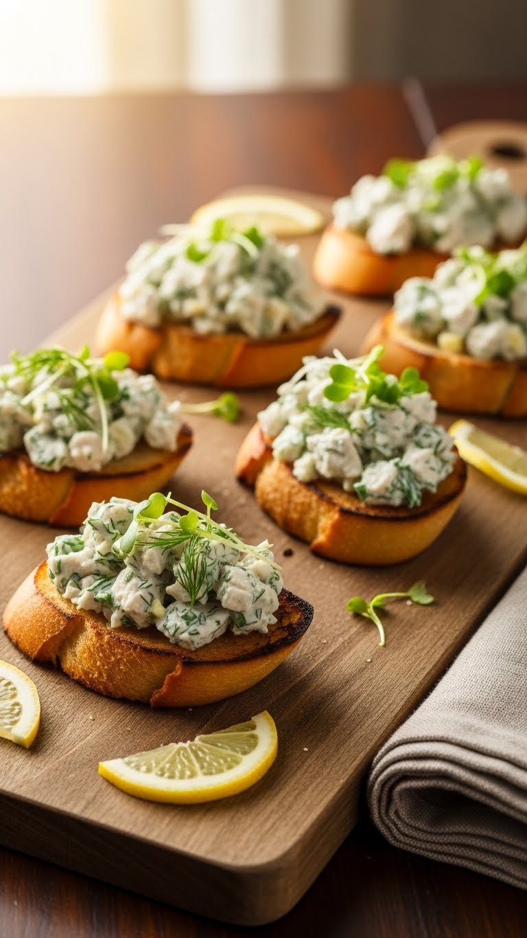 Serve on a tiered tray for pretty height. Add lemon wedges and a scattering of microgreens. Pair with a light rosé or iced tea. Store chicken salad in the fridge up to 3 days; keep crostini in an airtight container to preserve crunch. Make-ahead: toast bread and make salad the day before.