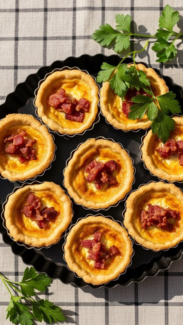 Serve warm on a wooden board with extra chives. Pair with a simple green salad and mimosas. Store cooled quiches in fridge up to 3 days, then reheat at 350°F (175°C) for 8–10 minutes. Make-ahead: bake the day before and reheat before serving.