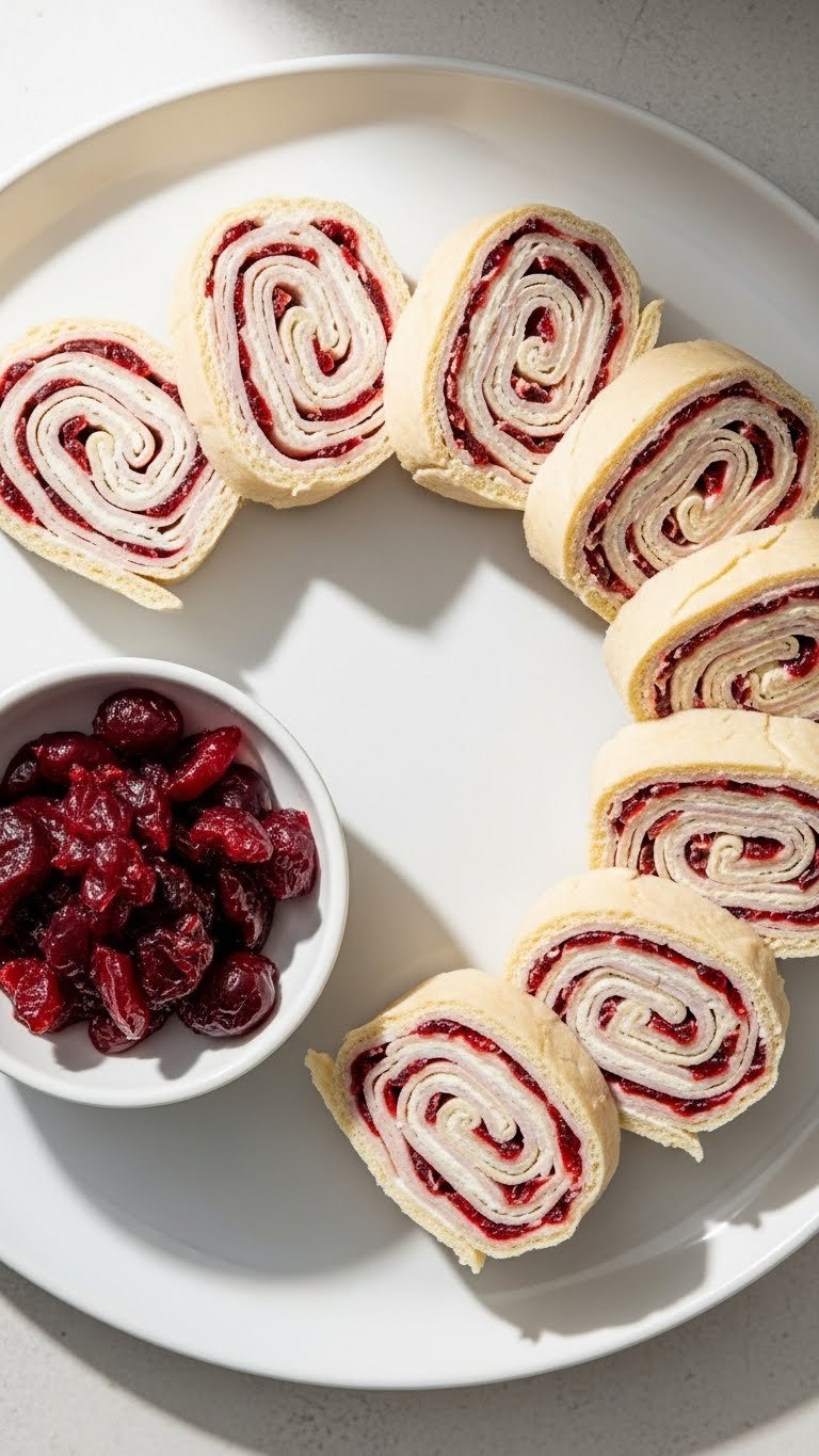 Serve skewered with toothpicks on a decorative platter. Pair with sparkling cider or rosemary lemonade. Store rolls wrapped in fridge up to 24 hours; slice just before serving. Make-ahead: assemble up to a day ahead for easy slicing.
