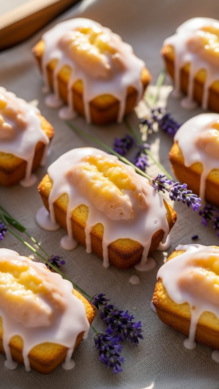 Serve on a cake stand dusted with powdered sugar and lavender sprigs. Pair with Earl Grey tea or a lemon spritzer. Store cakes in airtight container up to 3 days; glaze best fresh. Make-ahead: bake a day ahead and glaze before serving.